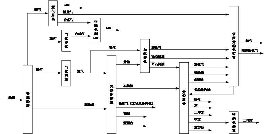 規(guī)劃以煤炭資源為基礎(chǔ),將煤化工領(lǐng)域的粉煤熱解、焦油加氫、煤氣凈化以及石化領(lǐng)域的加氫裂化、芳烴聯(lián)合、輕烴芳構(gòu)化等生產(chǎn)技術(shù)進行耦合,實現(xiàn)煤炭分質(zhì)利用制芳烴,完成煤炭的分質(zhì)、清潔、高效轉(zhuǎn)化,減少了對石油原料的依賴性,實現(xiàn)了煤代原油大批量生產(chǎn)芳烴的可能性。
