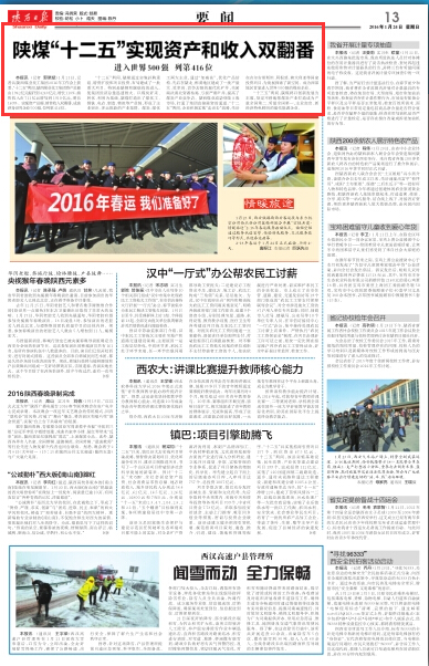陜西日報:2016年1月24日 13版 陜煤“十二五”實現(xiàn)資產(chǎn)和收入雙翻番 進入世界500強 列第416位 本報訊(記者 郭曉斌)1月21日,記者從陜西煤業(yè)化工集團2016年工作會上獲悉,“十二五”期間,陜西煤業(yè)化工集團資產(chǎn)總額由1942億元提升到4243億元,增長118%;銷售收入由711億元增加到1910億元,增長169%。實現(xiàn)資產(chǎn)總額、銷售收入雙翻番,成功躋身世界企業(yè)500強,位列第416位。 …