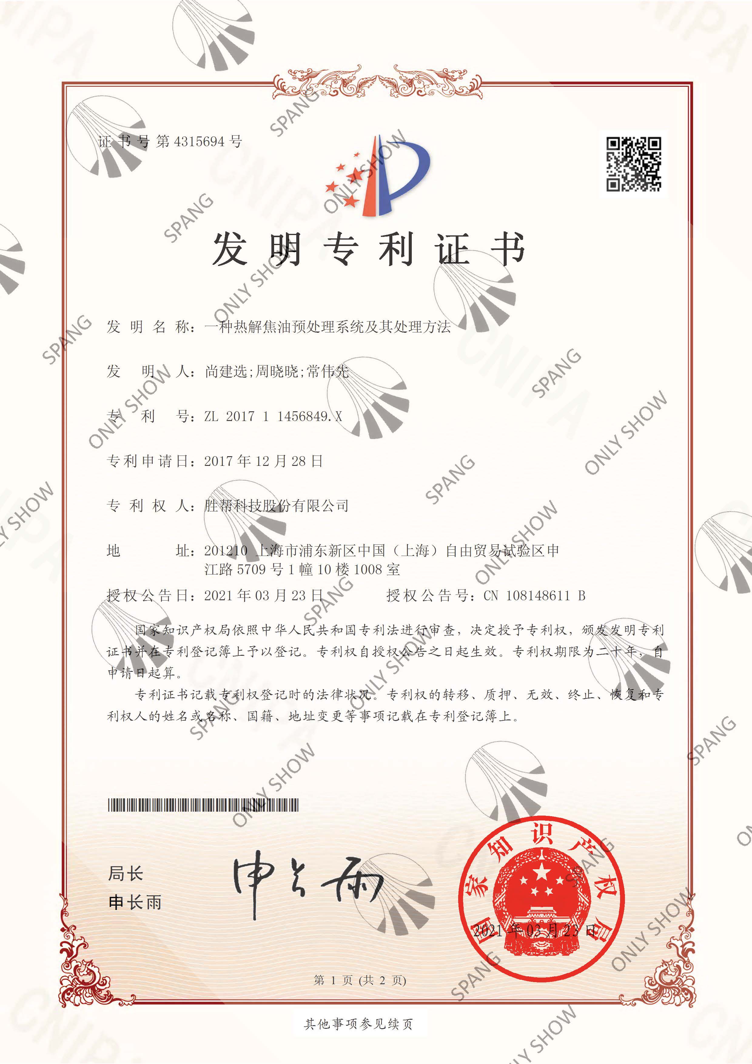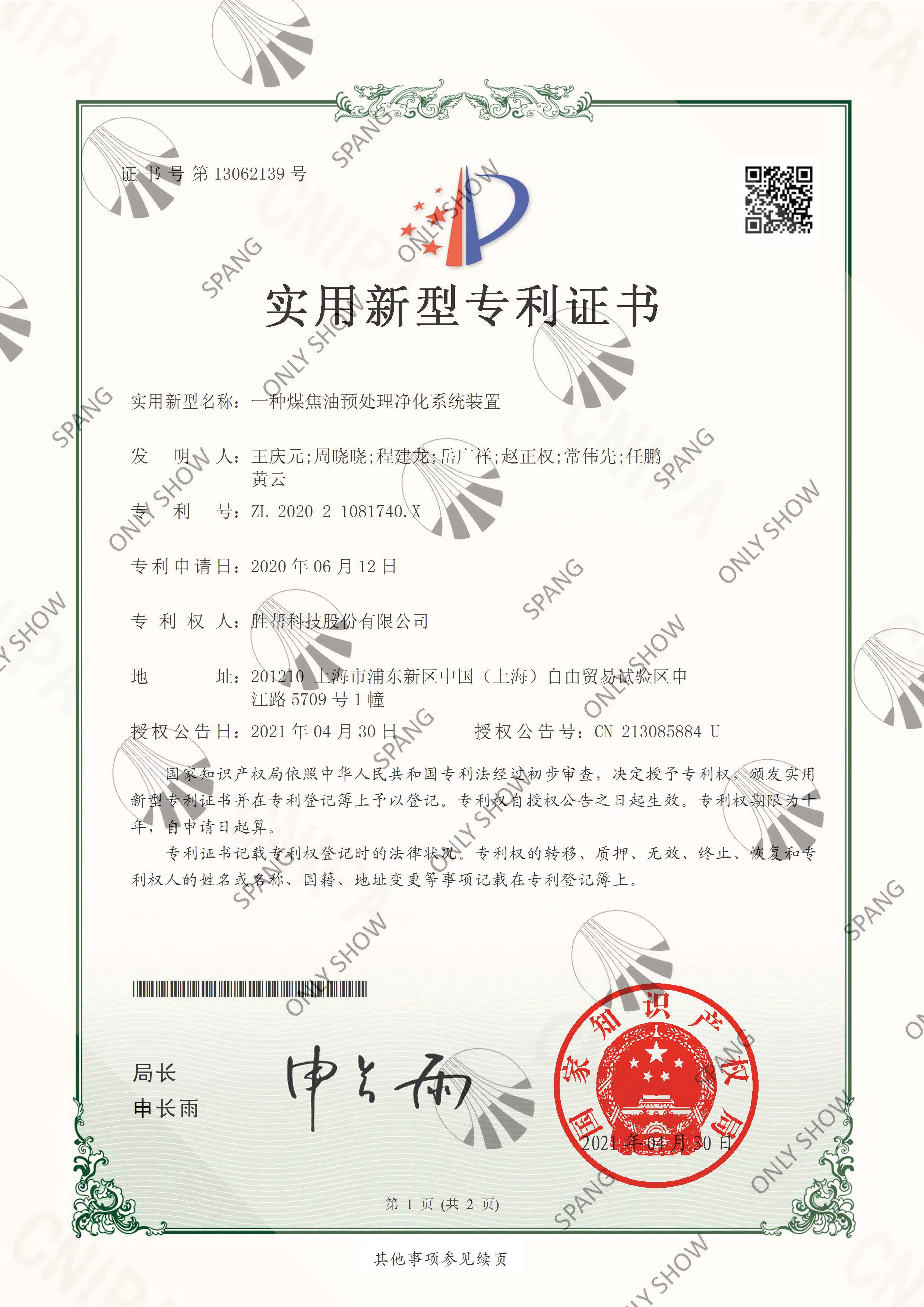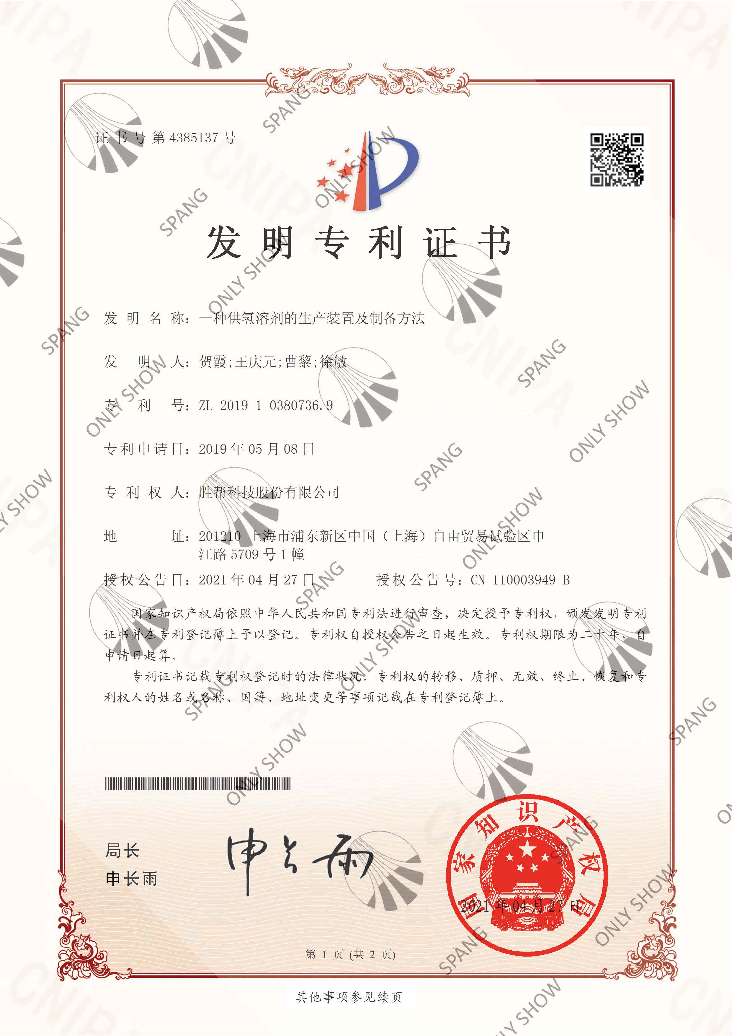 我司《一種熱解焦油預處理系統(tǒng)及其處理方法》、《一種生產供氫溶劑的裝置及方法》、《一種供氫溶劑的生產裝置及制備方法》、《一種煤焦油預處理凈化系統(tǒng)裝置》4項發(fā)明專利獲得國家知識產權局授權,其中包括三項發(fā)明專利、一項實用新型專利。根據勝幫專利獎金獎勵辦法,已對專利相關申請人進行獎金發(fā)放。