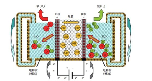 在外部電源作用下,堿性電解液中的OH-吸附在陽極催化層,經催化后OH-失去電子成為O2和水,產生的自由電子經陰陽極間的外接電路到達陰極。被吸附在陰極催化層的水分子獲得電路供給的電子,生成氫氣和OH-。堿性電解液中部分OH-和H2O會通過隔膜,在兩個電解槽之間發(fā)生遷移和擴散,保持槽內離子濃度的平衡,維持兩極電解區(qū)域的電中性。堿性電解池電解原理示意圖如圖2.1-1所示。
