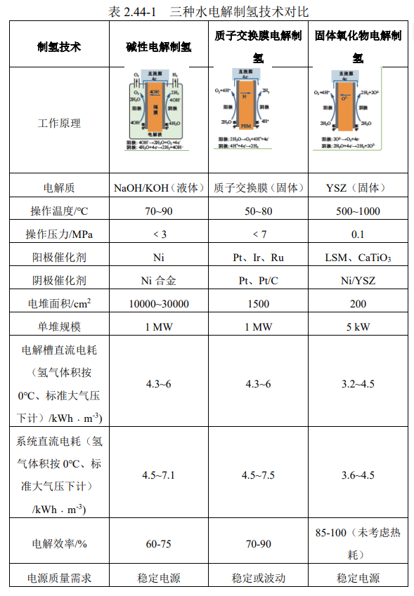 根據(jù)電解液的不同,當前被認為可大規(guī)模推廣的電解制氫技術主要分為3種:堿性電解、質子交換膜電解和固體氧化物電解。表2.4-1是三種水電解制氫技術對比,表2.4-2為電解水和其它工業(yè)制氫技術對比。