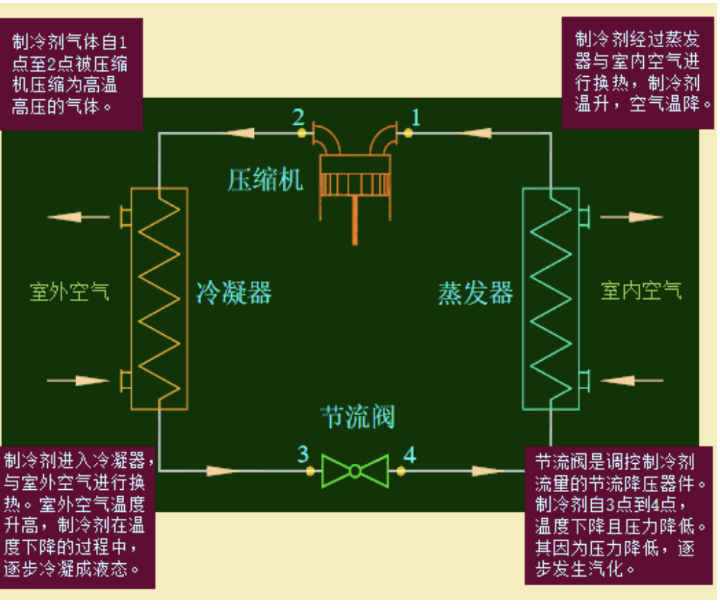 空調(diào)由四大部件組成,有蒸發(fā)器、壓縮機(jī)、冷凝器、節(jié)流閥(或膨脹閥)。還有一個重要的介質(zhì)便是制冷劑。夏季,室內(nèi)空氣通過進(jìn)風(fēng)口進(jìn)入機(jī)組內(nèi),蒸發(fā)器中的制冷劑吸收室內(nèi)空氣的熱量,制冷劑由低溫低壓的氣液混合物(氣體多、液體少)變?yōu)橹袦氐蛪旱臍怏w,之后經(jīng)過壓縮機(jī)壓縮為高溫高壓的氣體,再在冷凝器側(cè)放熱變?yōu)橹袦馗邏旱臍庖夯旌衔铮怏w少、液體多),后由節(jié)流閥減壓為低溫低壓的氣液混合物(氣體多、液體少),又回到蒸發(fā)器,循環(huán)往復(fù)。在蒸發(fā)器側(cè)被降溫后的空氣重新送入房間,冷凝器側(cè)放出的熱量在風(fēng)機(jī)的動力下被室外空氣帶走。原理見下圖1。