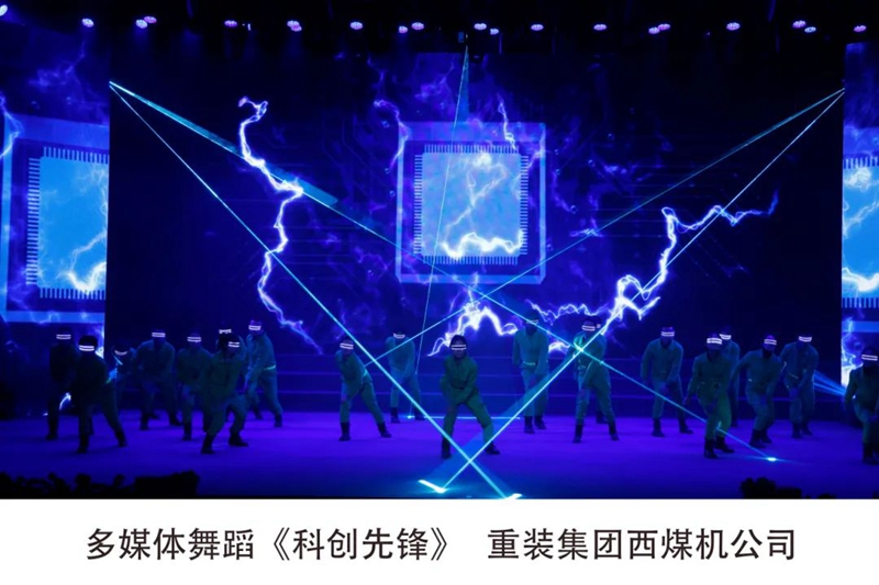 多媒體舞蹈《科創(chuàng)先鋒》,以現(xiàn)代舞和魔術(shù)表演相結(jié)合的藝術(shù)形式,生動(dòng)展現(xiàn)了趙亦輝及其團(tuán)隊(duì)探索、研發(fā)10米超大采高煤機(jī)裝備,將其推向世界的突破,頌揚(yáng)科技工作者的創(chuàng)新精神與愛國(guó)情懷,展示科技創(chuàng)新的力量與魅力。