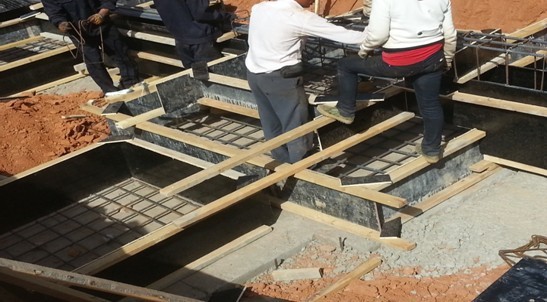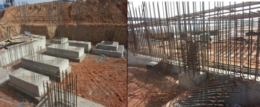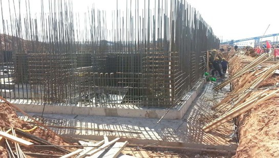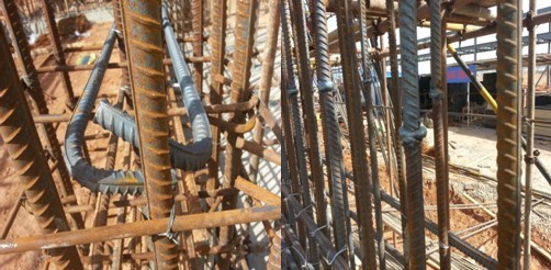 現(xiàn)場(chǎng)施工人員正在調(diào)整基礎(chǔ)梁的布筋