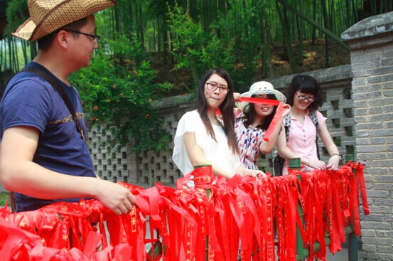 途中經過一座寺廟,在這里我們看到了現(xiàn)代交通工具的雛形-獨輪車,感嘆先人們的智慧。今天是父親節(jié),懷著一顆感恩的心,在大師的引導下為父母祈福,愿他們健康長壽。山頂上的竹林迷宮,內設十二個生肖亭,亭內設名人屬相牌,大家都玩的不亦樂乎。清新的空氣,涓涓的細流,巖石中的樹木……這里的一切讓我們回歸自然,讓我們的心不再浮躁,和自然融為一體。