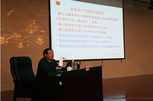 講座中,支同祥從新《安全生產(chǎn)法》修改背景、思路、原則、要求、經(jīng)過等五個方面進(jìn)行講解,重點(diǎn)對新《安全生產(chǎn)法》的修法要點(diǎn)、涉及到的六個重點(diǎn)變化、十二個增加、十個完善、十個創(chuàng)新作了詳細(xì)的分析和說明。他指出,新《安全生產(chǎn)法》牢固樹立以人為本、生命至上的理念,堅守發(fā)展決不能以犧牲人的生命為代價這條“紅線”,建立生產(chǎn)經(jīng)營單位負(fù)責(zé)、職工參與、政府監(jiān)管、行業(yè)自律、社會監(jiān)督的機(jī)制,進(jìn)一步明確了各方安全生產(chǎn)職責(zé)。對于建立健全“黨政同責(zé)、一崗雙責(zé)、齊抓共管”的安全生產(chǎn)責(zé)任體系,進(jìn)一步提升安全生產(chǎn)工作的重要地位、強(qiáng)化生產(chǎn)經(jīng)營單位主體責(zé)任、加強(qiáng)政府監(jiān)管、強(qiáng)化責(zé)任追究,預(yù)防和減少生產(chǎn)安全事故,保障人民群眾生命和財產(chǎn)安全,促進(jìn)經(jīng)濟(jì)社會持續(xù)健康發(fā)展具有重大意義。支同祥強(qiáng)調(diào),新《安全生產(chǎn)法》的頒布實(shí)施是安全生產(chǎn)的一件大事,學(xué)習(xí)實(shí)施新《安全生產(chǎn)法》是貫徹黨的四中全會精神的重要任務(wù)。今后對于新《安全生產(chǎn)法》的落實(shí)應(yīng)用,一要深入學(xué)習(xí)理解。企業(yè)各級領(lǐng)導(dǎo)帶頭學(xué),安全管理人員帶頭學(xué),帶動車間、班組、各類操作人員全面學(xué)習(xí),深入理解,做到知法、懂法、守法;二要大力宣傳貫徹。企業(yè)各級領(lǐng)導(dǎo)要高度重視,提高對新安全法宣傳貫徹重要性的認(rèn)識,加大工作力度,廣泛宣傳,掀起新高潮,進(jìn)一步營造安全法治氛圍;三要全面推進(jìn)實(shí)施,各類企業(yè)要采取各種措施,推進(jìn)新《安全生產(chǎn)法》的全面實(shí)施,強(qiáng)化企業(yè)主體責(zé)任,強(qiáng)化安全預(yù)防,增強(qiáng)安全保障能力,做到依法依規(guī)生產(chǎn),杜絕違法違規(guī),防范各類事故,推進(jìn)企業(yè)安全生產(chǎn)形勢的持續(xù)穩(wěn)定好轉(zhuǎn)。